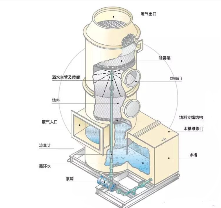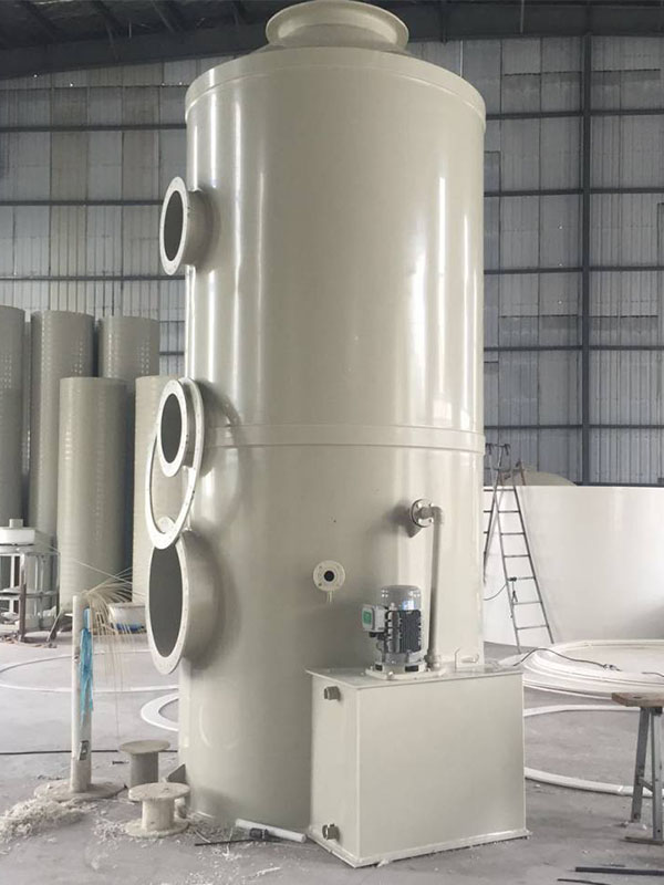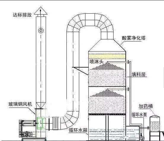 酸霧廢氣由風管引入凈化塔,經過填料層,廢氣與氫氧化鈉吸收液進行氣液兩相充分接觸吸收中和反應,酸霧廢氣經過凈化后,再經除霧板脫水除霧后由風機排入大氣。吸收液在塔底經水泵增壓后在塔頂噴淋而下,最后回流至塔底循環(huán)使用。凈化后的酸霧廢氣達到廣東省地方排放標準的排放要求,低于國家排放標準。